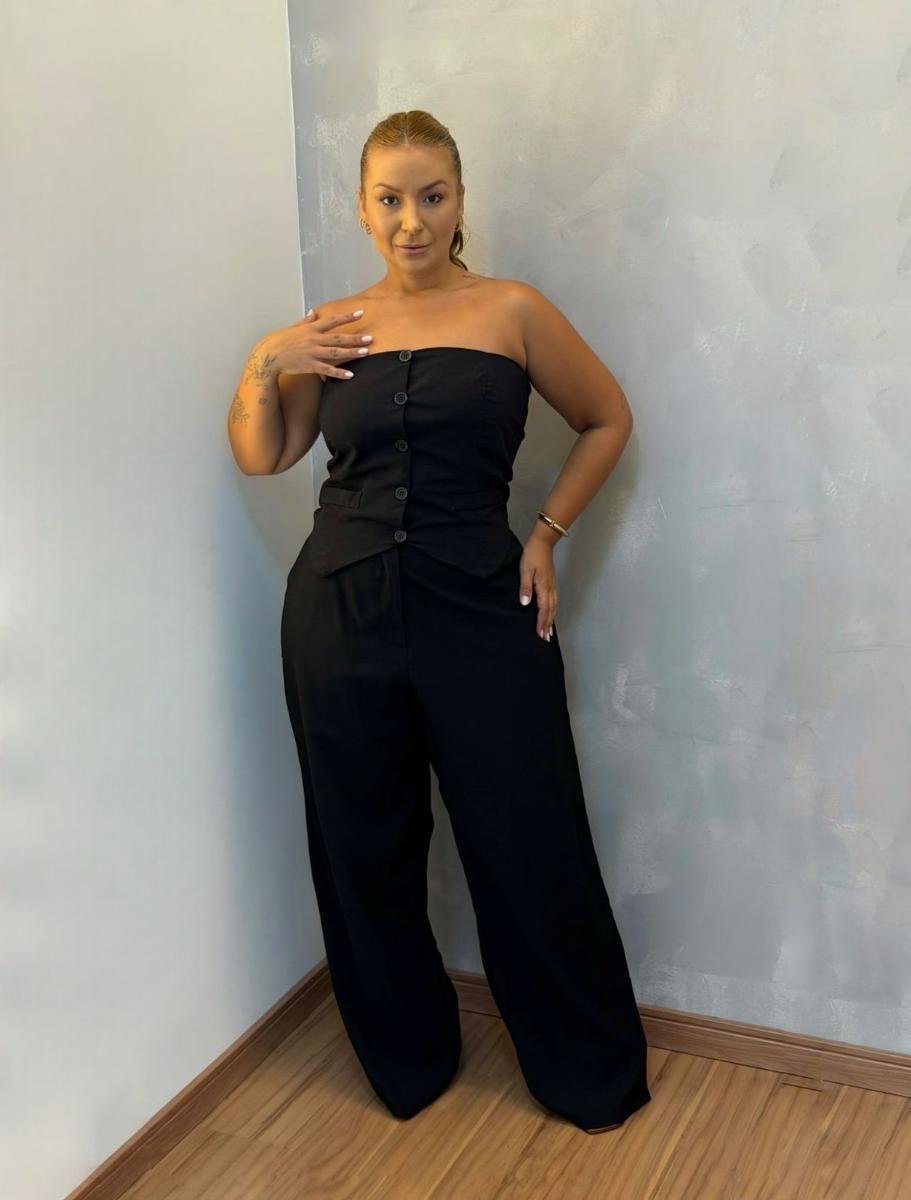 Conjunto no tecido alfaitaria composto por blusinha e calça.