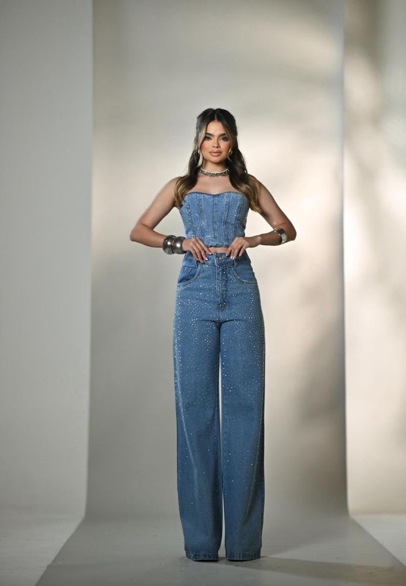 Conjunto jeans com brilho, composto por cropped e calça wide leg.