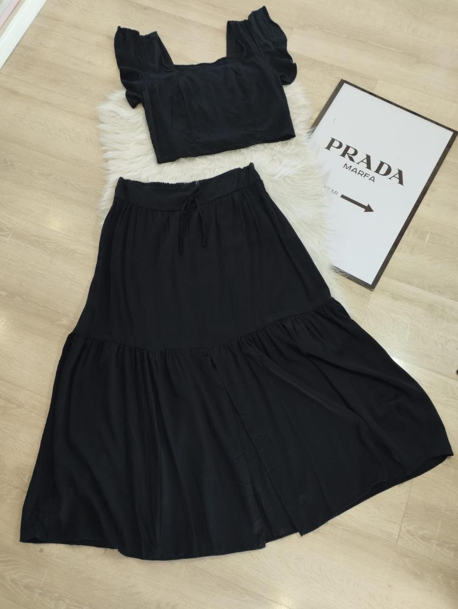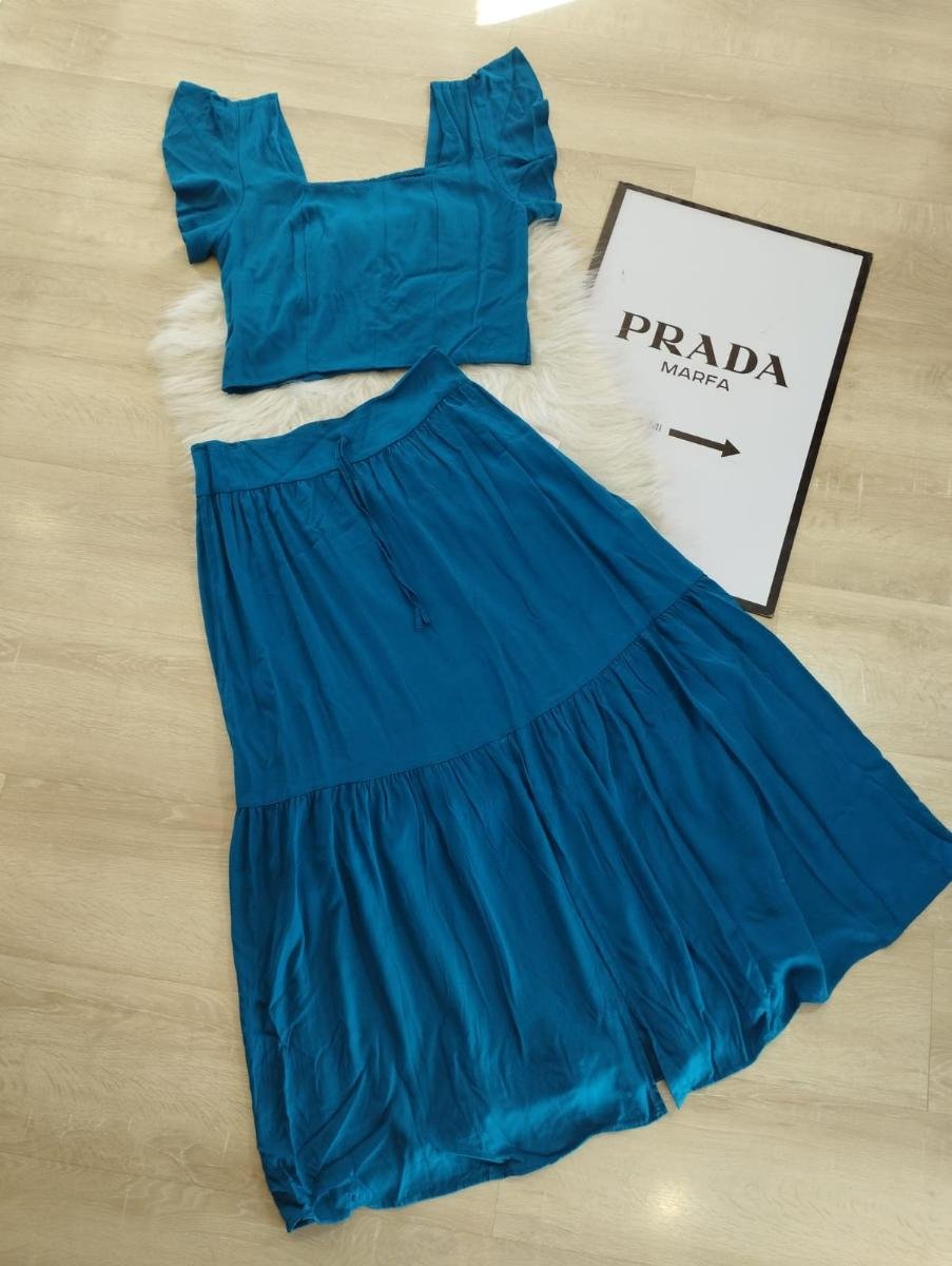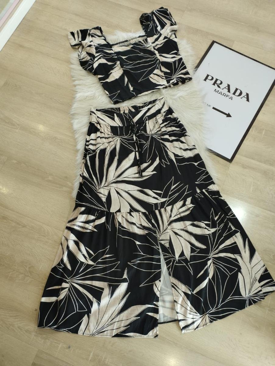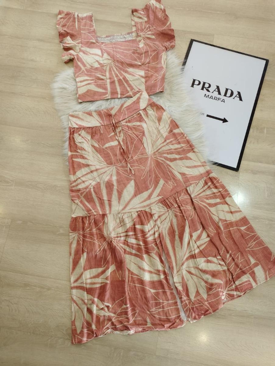 Conjunto no tecido viscolinho composto por cropped e saia com fenda