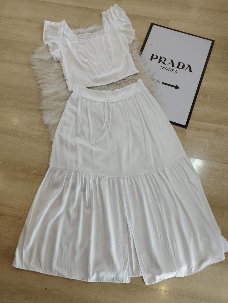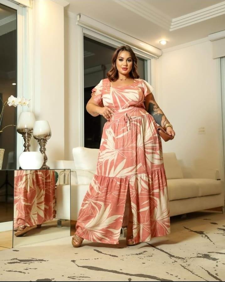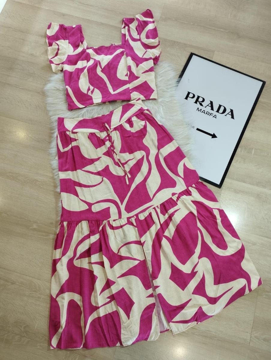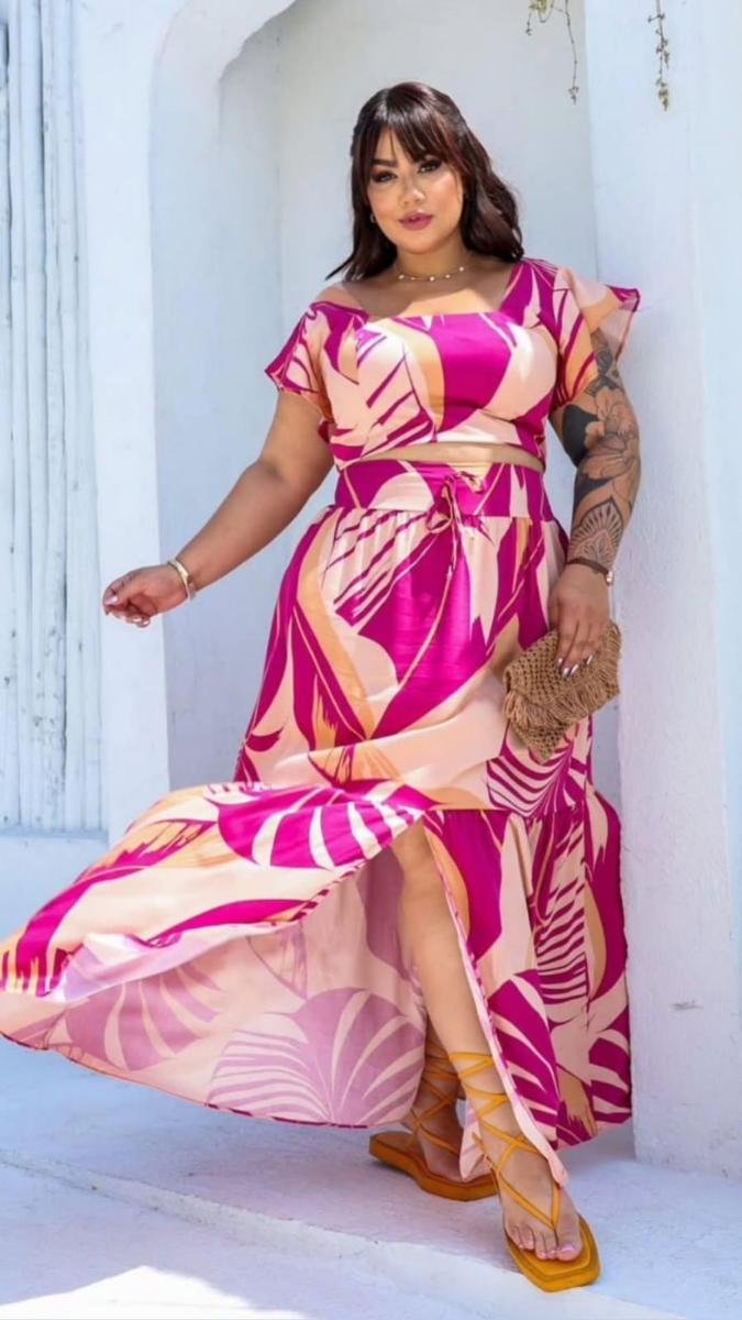 Conjunto no tecido viscolinho composto por cropped e saia com fenda